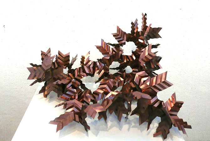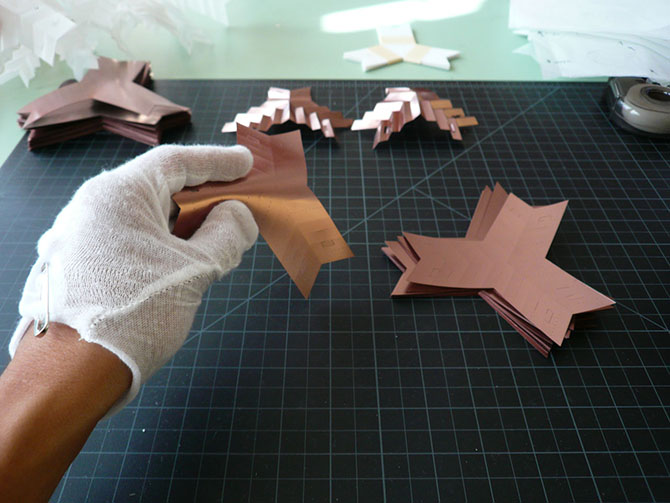 Consisting of painted .005 mil mylar, the primitive utilizes a series of folds along each axis of it’s legs, to create a light, yet rigid structure that affords specific ways of connection and growth. The inherent dull finish of mylar is not extraordinary, however, through the application of a copper-metallic paint, the primitive transforms into an object of intense luminousity. The application of paint to the inside surfaces of the primitive evoke a notion of the precious interior, shrouded by a protective exterior shell. Each leg comprises of identical slot and tab connections, such that each primitive may attach in a consistent manner. The two sizes of primitives (100%, and 110%), allow for growth and contraction where needed, however the main area of growth is provided by an odd-number progression of Negative Space Polygons (NSP, see “Process” below). At a micro scale, the symmetric folds allow for a firm spring-like flex within the primitive, bringing an elasticity that is atypical of mylar in its common form/orientation