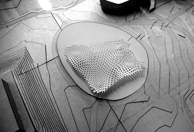 Materials and light represent to the experienced designer the medium to imagine and conceptualize space and form with thicknesses, weight, color, texture, mood and character. Furthermore, it is the control of this medium which enables the designer to successfully fuse the matters of constructability, cost, and other logistics with the visual, experiential, and utility agenda of space-making. Without the advantage of in-depth experience through practice, form-based manipulation is often then the primary means to conceptualize projects, and the actual medium of built architecture may be neglected or selected as an afterthought. One of the fundamental agendas of this studio is to consider materials along with the effects of light - both natural and artificial - as key means for conceptualizing architectural experiences. A determination of the appropriate size and scale for the pavilion shall be decided through study and experimentation. However, a rough guideline is W100’ x L100’ x H25’. The program is meant to be open-ended for multi-purpose use, but specific use cases such as lounge/bar, café/restaurant, wedding/banquet hall, and lecture/exhibition space should be imagined and represented. Integration of existing and new landscape/greenery is highly encouraged.